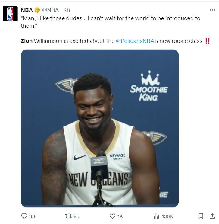 錫安也彰顯了自己的領袖風采,他表示很期待看到球隊新選中的年輕球員們,對他們的表現很憧憬。