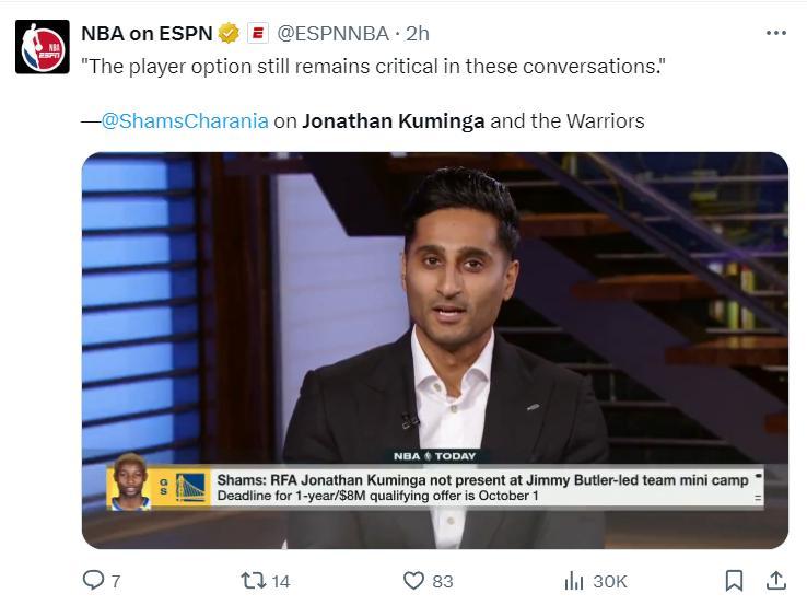 ESPN名記Shams在播客節目中透露,庫明加與勇士達成續約的關鍵是球員選項,庫明加方面希望球隊將球隊選項換成球員選項,庫明加的團隊更想把控自己的未來,只要勇士鬆口簽約將會達成。