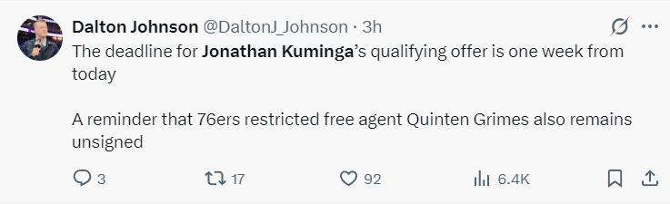 NBA記者Dalton Johnson寫道:距離新賽季資格賽的報名只剩下一週的時間,庫明加、格蘭姆斯都還沒有跟球隊達成續約。(威少也還沒有找到下家)