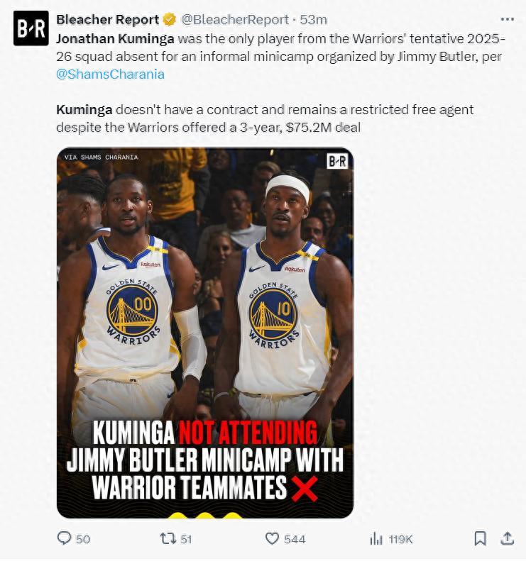北京時間9月25日,根據ESPN的報道,勇士球員吉米-巴特勒本週在聖迭戈舉辦的非正式迷你訓練營,喬納森-庫明加是唯一缺席的球員,據悉本次迷你訓練營並不受球隊管理,只要受邀的人員都可以參與。庫明加目前還未與勇士簽約他是受限制的自由球員,儘管勇士爲他提供了三年7520萬(含球隊選項)的合同,但他還是沒簽約。
