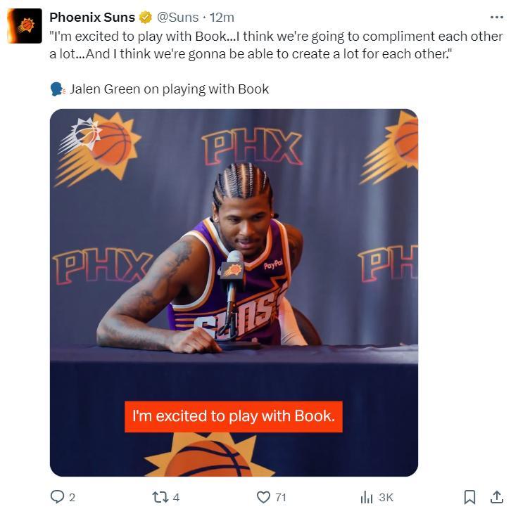 杰倫-格林在媒體日採訪時說道:“我很期待新賽季的到來,很期待與布克聯手一起打球,我覺得我們之間會有很多默契,我們能夠爲彼此創造出很多的美好瞬間。”