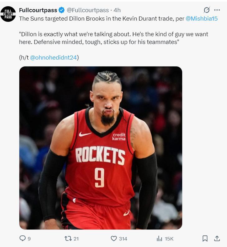 太陽老闆伊什比亞也談到狄龍:當我們與火箭談關於杜蘭特的交易時,我最想得到的人就是狄龍,他的強硬、防守都是我們需要的,他還會爲隊友出頭。