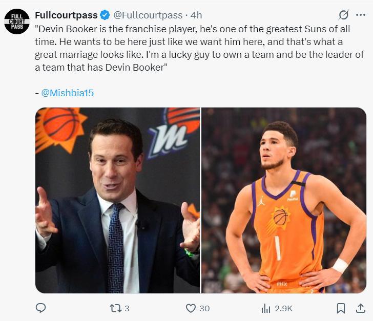 太陽老闆伊什比亞也在媒體日發聲:布克是我們當家球星,也是太陽隊史最偉大的球星之一,他渴望留在這裏,這是我們之間的完美結合體現,我很高興能擁有這樣一支球隊並且有布克這樣一位領袖 。
