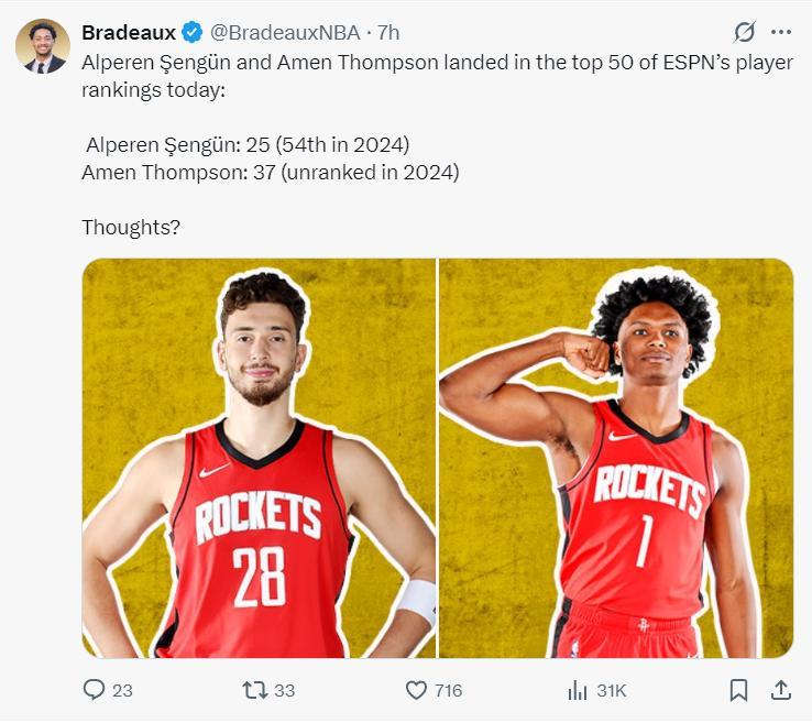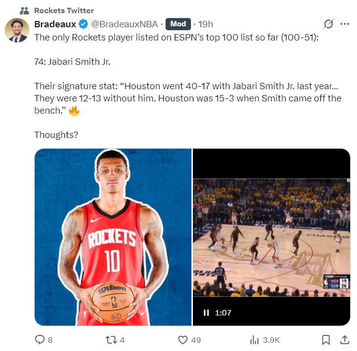 休斯頓火箭隊在100-51排名內只有一人入選,那就是小賈巴里-史密斯,他排在2025年第74位,火箭記者認爲小賈進入百大球星的理由,去年火箭有小賈的比賽40勝17負,他缺席的比賽12勝13負,當小賈替補時火箭15勝3負。