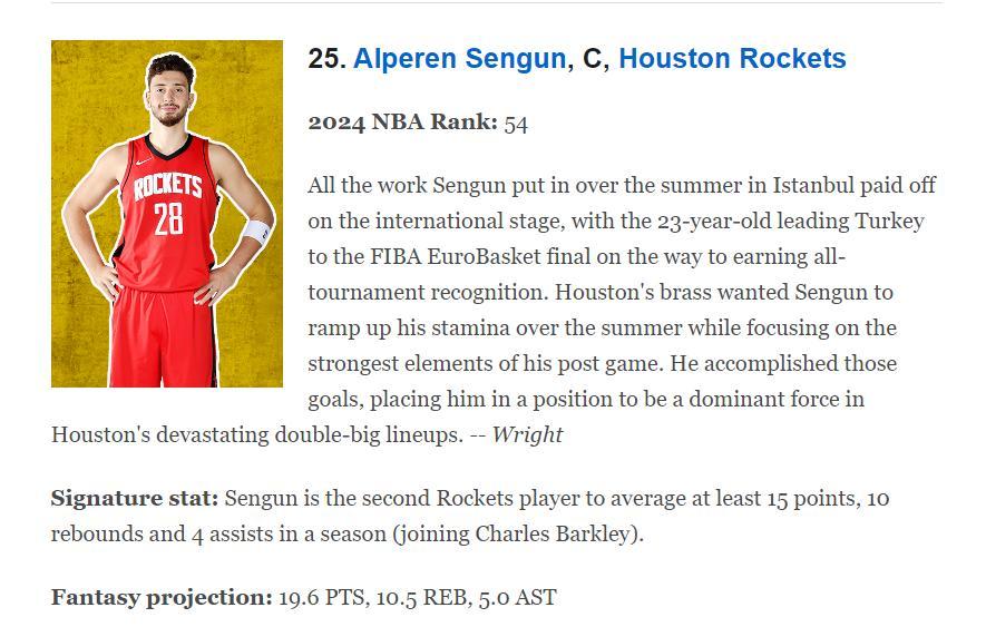 ESPN對申京的評語:這位23歲的球星今夏幫助土耳其男籃打入FIBA歐洲盃決賽並且他入選最佳陣容獲得認可,整個夏天申京都很有統治力,同時他上賽季是火箭西部第二的關鍵,他是火箭隊的主導力量。