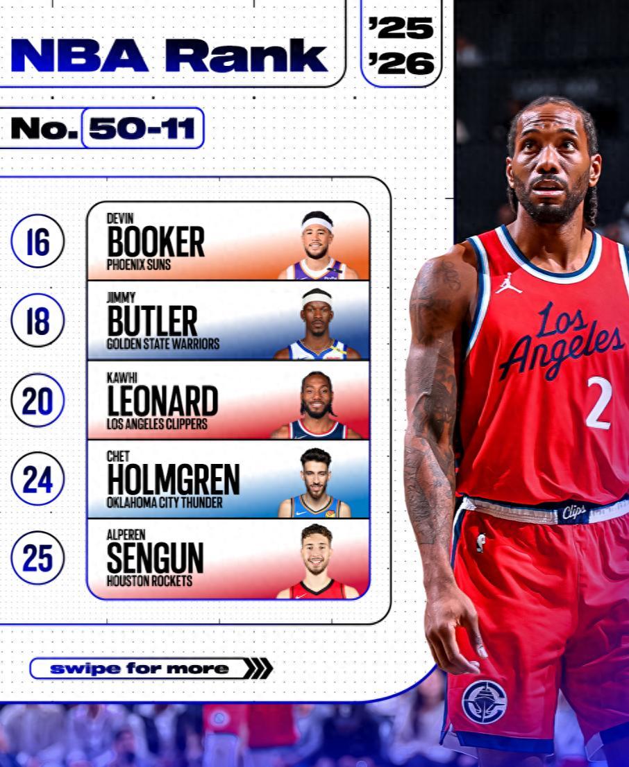 北京時間9月25日,ESPN評選的2025年百大球星已經更新到50-11了,雷霆隊的杰倫-威廉姆斯排在第11,倫納德20,巴特勒18,布克16分,霍姆格倫24,申京25。
