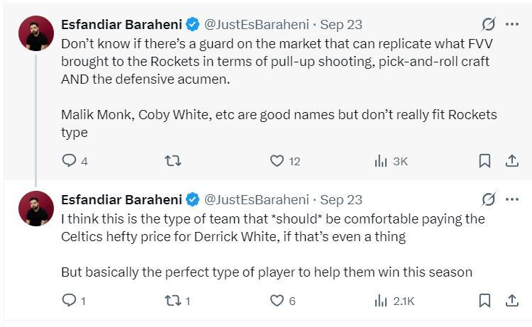 9月23日時NBA記者Esfandiar Baraheni就表示:我知道聯盟中有不少人可以完成FVV的突破、擋拆、防守,比如馬利克-蒙克、科比 -懷特都不錯,可他們跟火箭風格有些不相符。最適合火箭隊的後衛是德里克-懷特,如果火箭願意爲懷特付出高額的代價,那麼他肯定是最適合火箭的後衛。