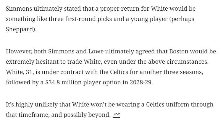 比爾-西蒙斯也提到要得到懷特代價肯定很高,可能要犧牲三個首輪選秀權與一個年輕資產(大概率是謝潑德),除此之外最好是可以繼續爲綠凱降低薪金空間減稅。