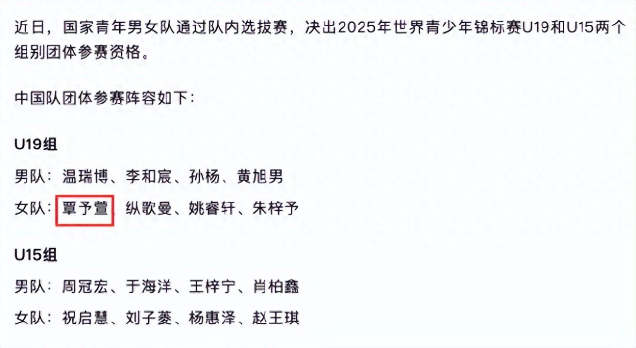 近日,乒乓世界公佈了中國U19與U15參與世青賽的大名單,我們能看到女隊是覃予萱排在U19女乒的頭名,男隊U19的頭名是溫瑞博,這兩人就是絕對核心,覃予萱這位19歲的超星實際上已經開始嶄露頭角。
