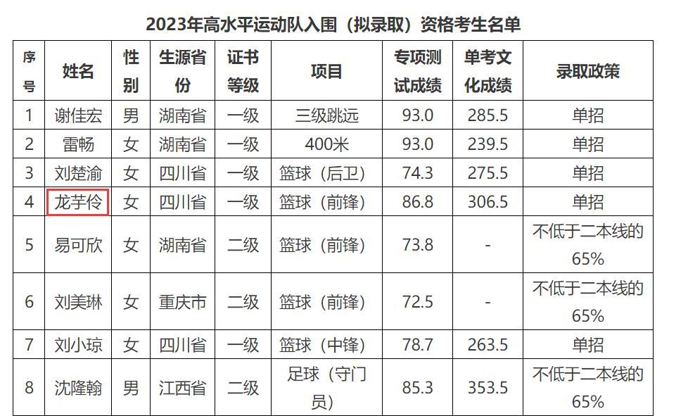 2023年龍芋伶以專項成績86.8分,文化成績306.5分單招進入了武漢科技大學,如果龍芋伶的文化成績再好一些她肯定能進入985/211而不是武漢科大這樣的雙非院校。