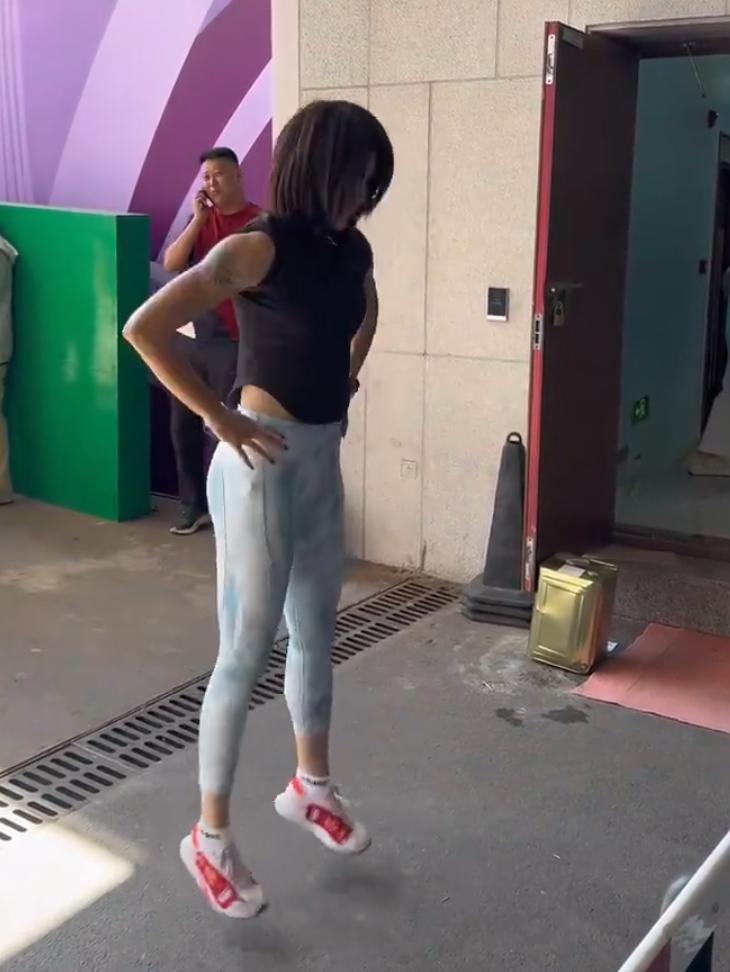 吳豔妮進行完了跑道訓練後又在選手通道進行了一些敏捷性的訓練,吳豔妮的大腿肌肉線條隔着運動褲也很明顯,她的確渾身都是肌肉。