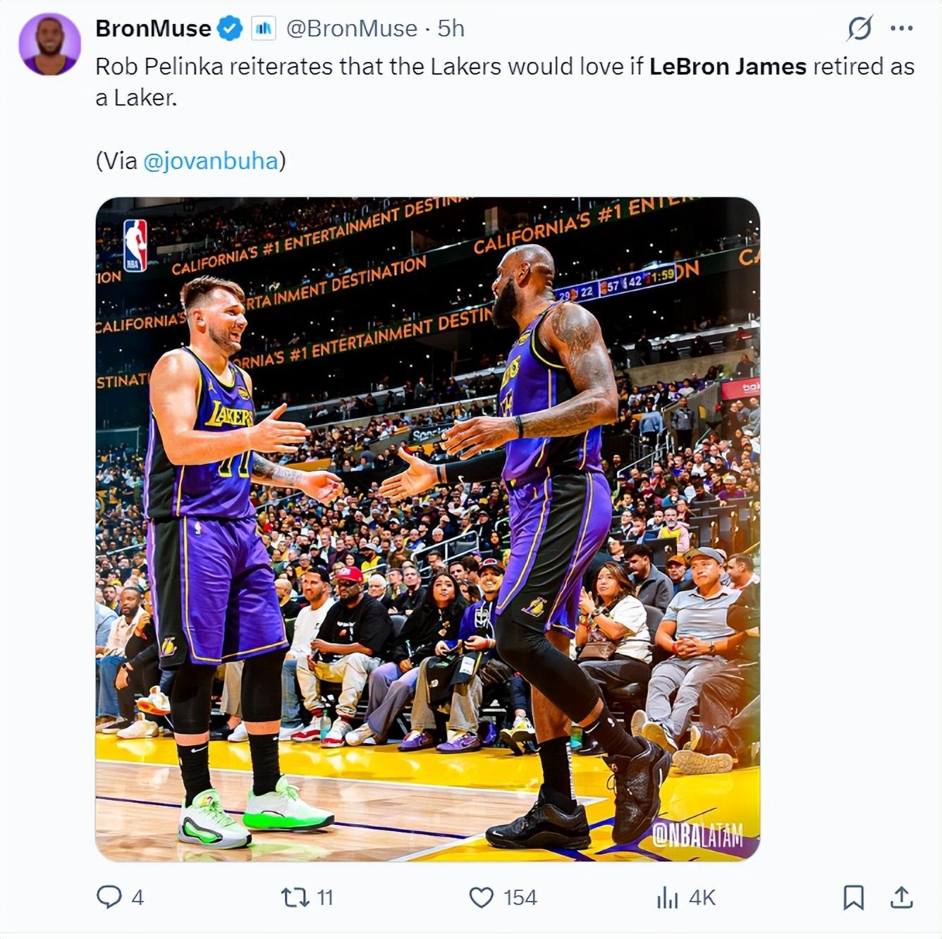 一小時後佩林卡又在採訪中透露:洛杉磯湖人隊很希望看到詹姆斯在LAL退役。(這兩個消息一同出來後感覺十分的割裂)