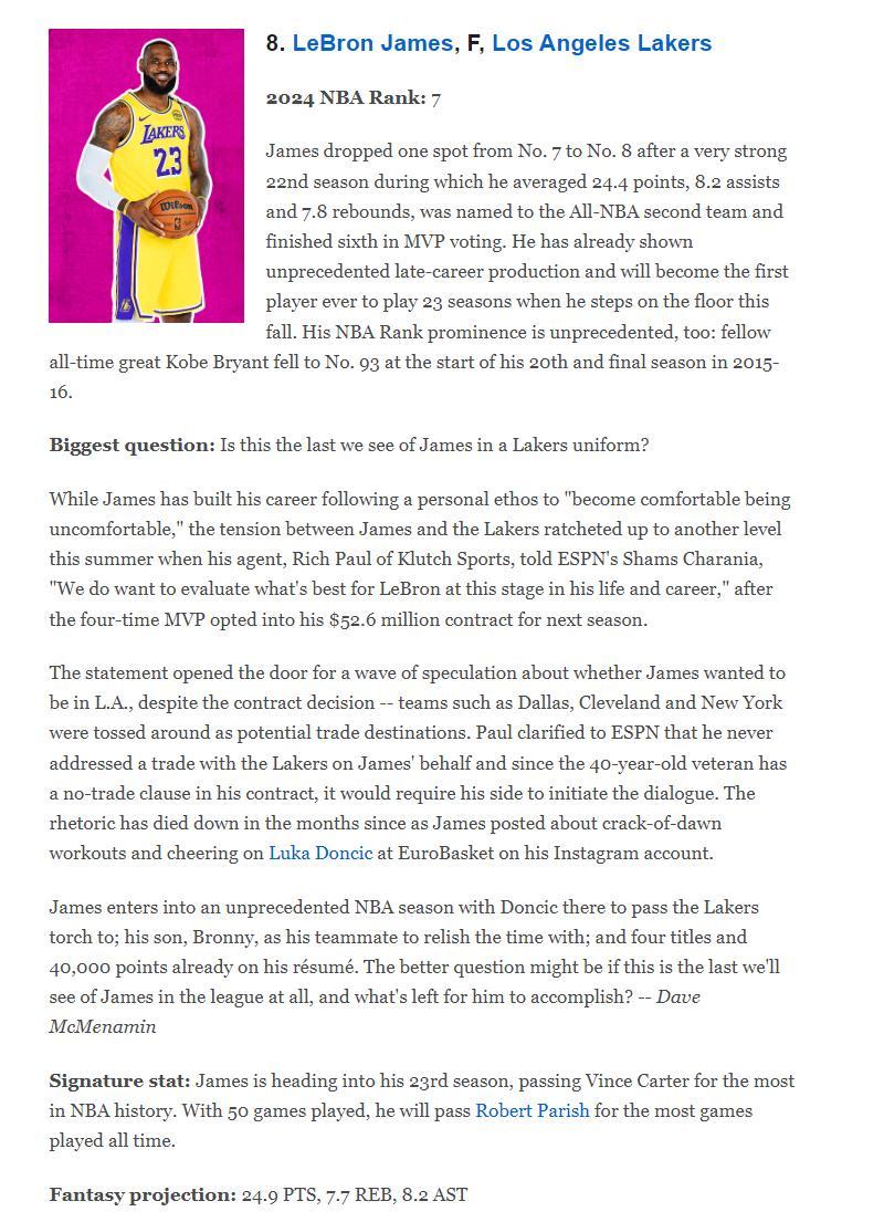 ESPN寫道:40歲詹從去年的第七下滑到今年的第八,他22個賽季依舊出色,場均24.4分8.2助攻7.8籃板入選最佳二陣,MVP投票排名第六。他將成爲歷史首位進入23個賽季的球員,要知道15-16賽季最後一個賽季的科比僅僅排在聯盟第93位。最大的問題是:這是我們最後一次看到勒布朗穿湖人球衣嗎?