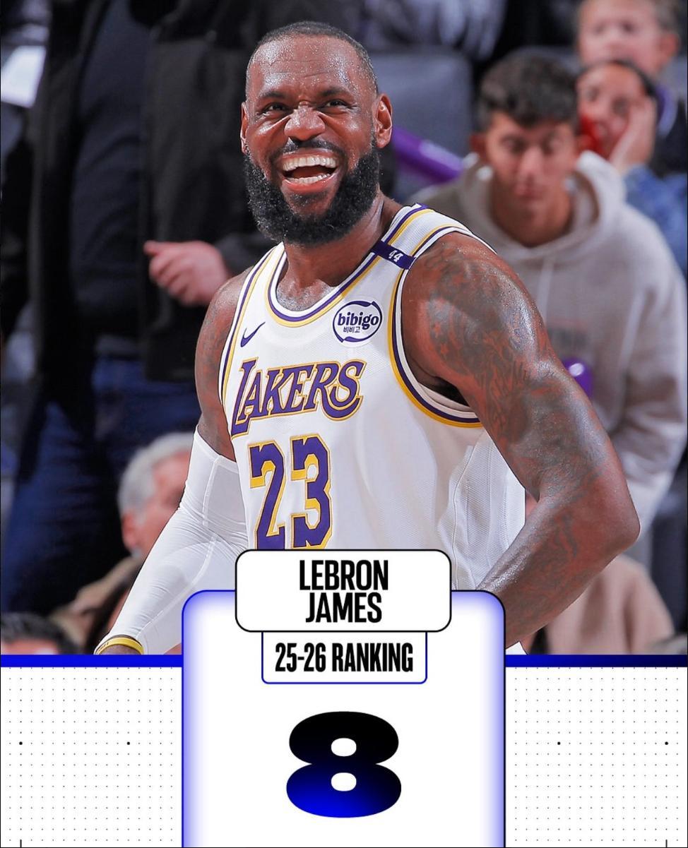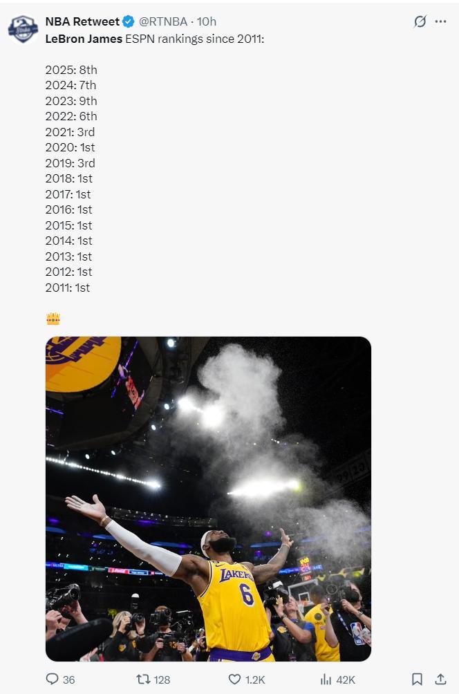 美媒更是曬出2011年-2025年勒布朗-詹姆斯在ESPN中的排名,2011-2018都是第一,2019是第三,2020年重返第一,隨後2021-2025分別是:3、6、9、7、8,一直都沒有跌出過聯盟前十。