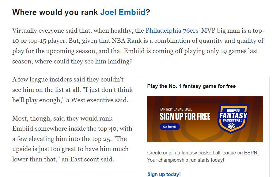 恩比德本人沒有回應他剛剛被ESPN排在47的話題(去年第八,今年直接跌至47),不過ESPN倒是自己解釋了爲什麼恩比德排名暴跌。