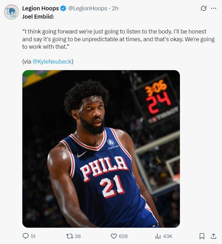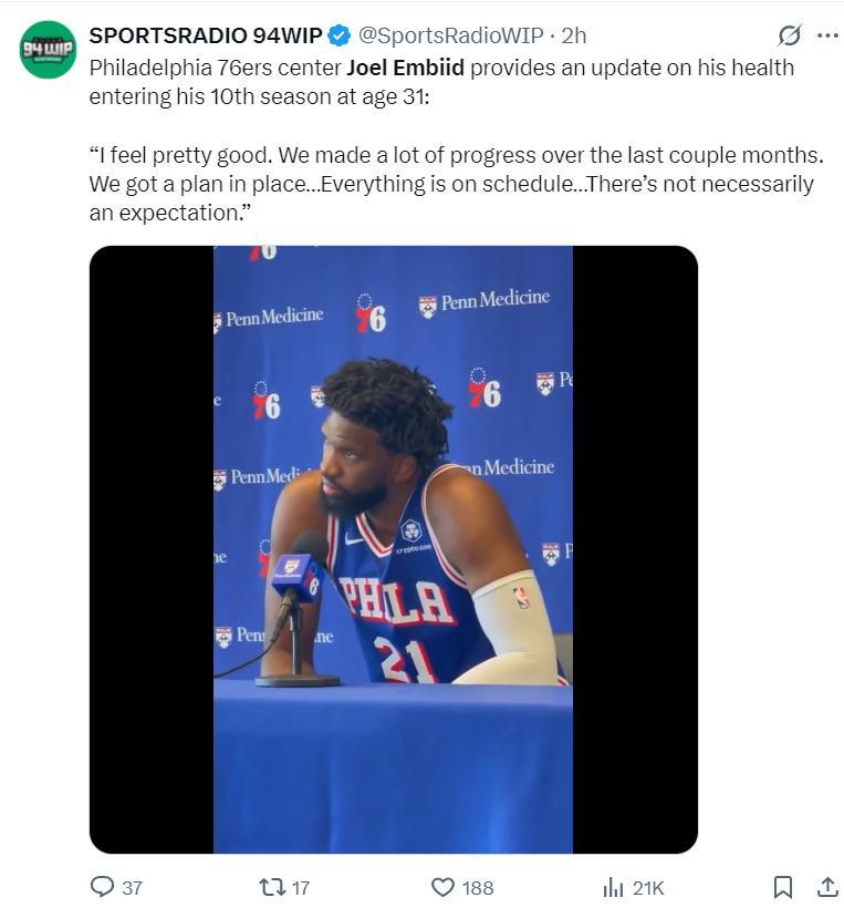 對於自己新賽季能打多少比賽,恩比德是這樣回應:我認爲接下來我們需要的是看身體的反饋,老實說傷病、健康這種情況很難預料,但沒關係我們會適應各種狀況的。