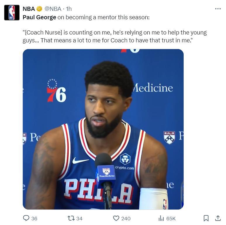 喬治還透露:教練組很信任我,他們希望我扮演導師的角色來幫助年輕球員進步,新賽季我也會更多時間出現在四號位,若十年前將我安排在四號位我肯定有所不滿,但如今的我感覺自己非常適合控球前鋒的角色,樂意讓年輕球員去主導側翼空間,爲格蘭姆斯、烏佈雷等人創造機會。