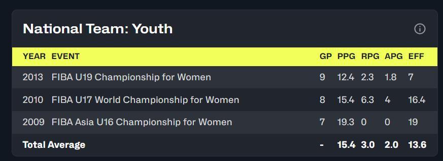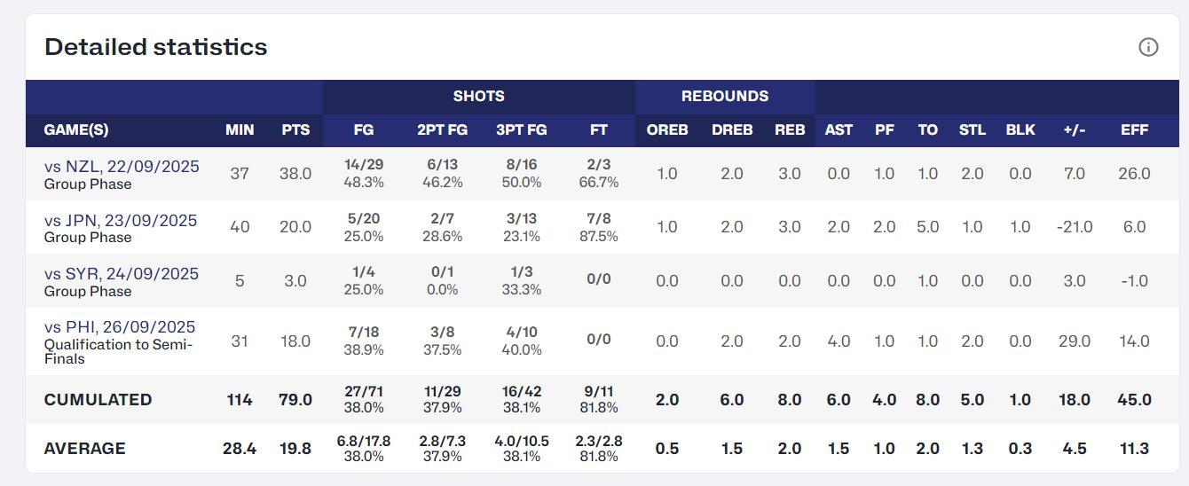 李沅珊在對陣敘利亞的比賽只打了5分鐘,因爲李建新要讓她保留體能來打淘汰賽,所以她的場均數據略有下滑,目前是場均28.4分鐘,拿到19.8分2籃板1.5助攻1.3搶斷0.3蓋帽,命中率38%,三分命中率38.1%,場均命中4個三分球。