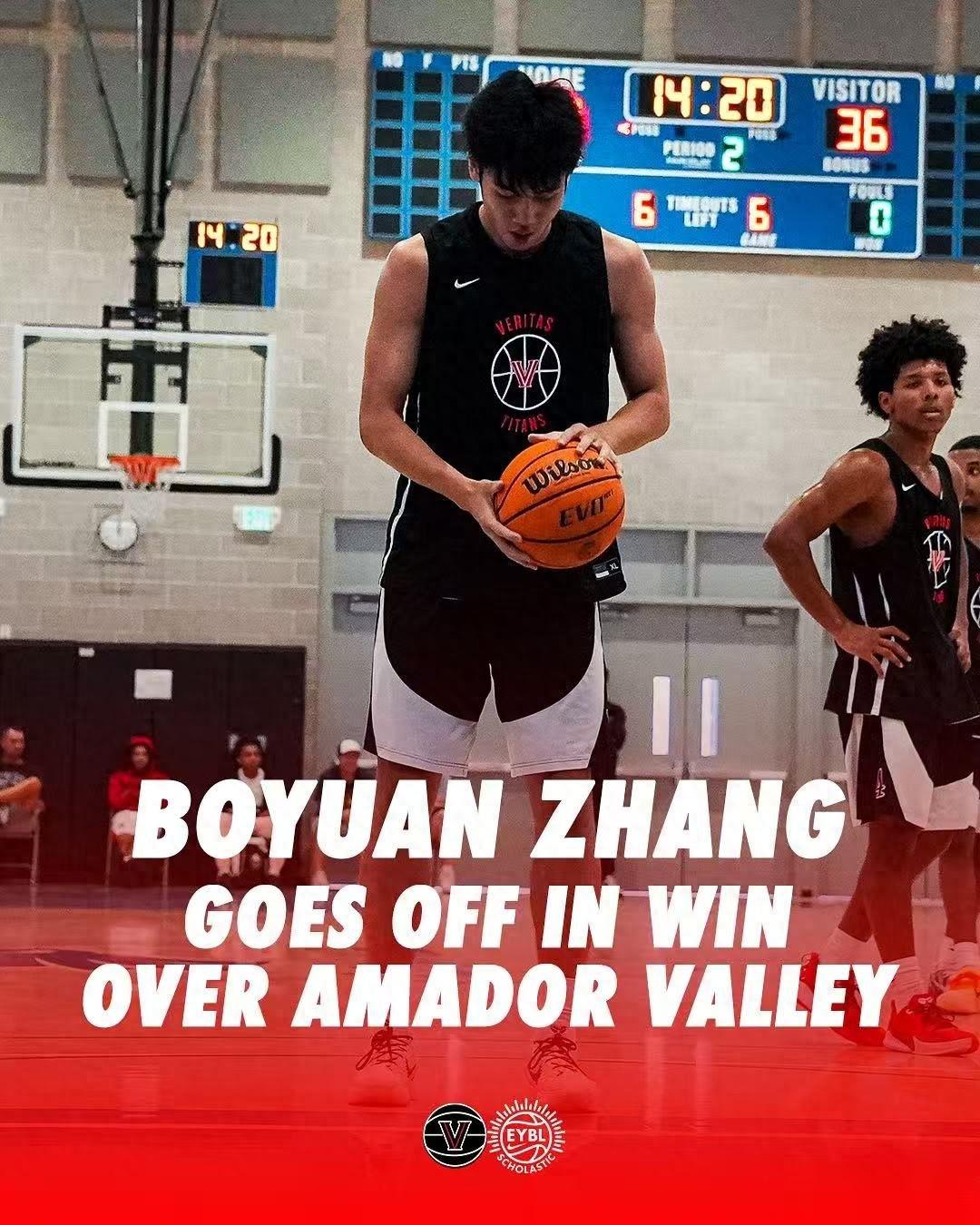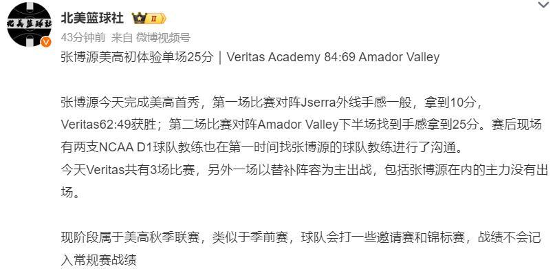 根據北美籃球社的報道,張博源美高第一場拿10分,但第二節就拿到25分6籃板2助攻,賽後現場有兩支NCAA D1球隊的主教練找到張博源球隊教練進行溝通,張博源已經獲得了多支NCAA D1球隊的青睞。