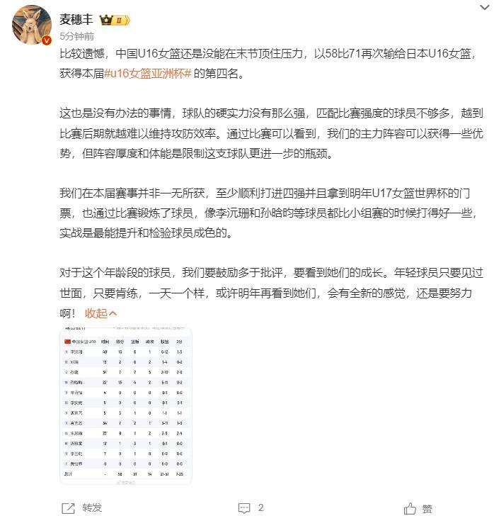 本次大賽我們並非一無所獲我們至少進入四強能打明年的U17世青賽,李沅珊、孫晗昀等球員都比小組賽打得更好一些,實戰對她們的檢驗是有成效的。
