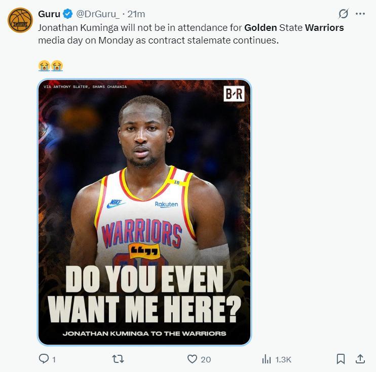 但是根據Shams的報道,喬納森-庫明加因爲跟勇士隊的續約沒有談攏,他將不會出席勇士隊的媒體日,勇士隊會在美國時間週三決定最終給庫明加什麼額度的合同。