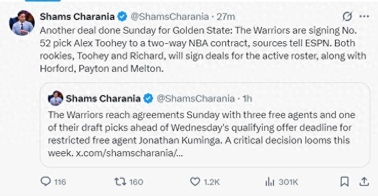 在勇士簽下威爾-理查德(56號秀)後,他們又跟52號秀亞歷克斯-圖希簽下了雙向合同,換言之勇士隊已經連續簽下五人:霍福德、小佩頓、梅爾頓、理查德、圖希。勇士跟理查德簽下的是四年新秀合同,前兩年全額保障。