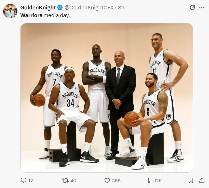 勇士媒體曬出一張極具諷刺的圖,那就是當年布魯克林籃網的養老大隊:皮爾斯、喬約翰遜、加內特、德隆威廉姆斯、大洛、基德,然後寫道:這就是勇士隊的媒體日。(暗示勇士隊就是當年的籃網養老大隊)