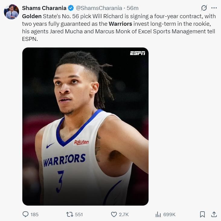 緊接着ESPN透露,勇士隊與今年56號秀威爾-理查德簽下了一份新秀四年合同,這份合同前兩年是全額保障,後面兩年是不保障+球隊選項。(另一位新秀52順位的圖希還沒有跟球隊簽約)