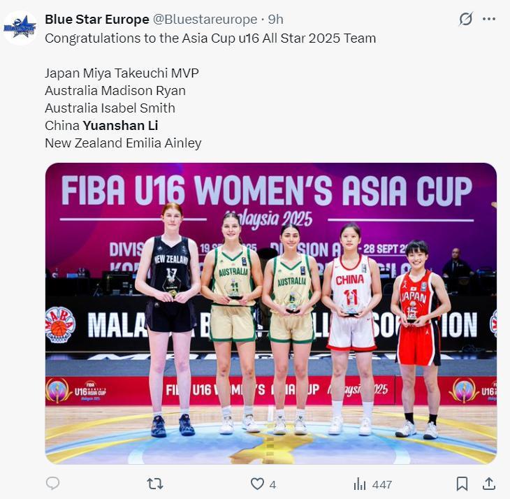球探也曬出了本次亞洲盃的最佳陣容名單,李沅珊(中國)、竹內美也(日本)、埃米莉亞-安利(新西蘭)、伊莎貝爾-史密斯(澳大利亞)、麥迪遜-瑞安(澳大利亞)。
