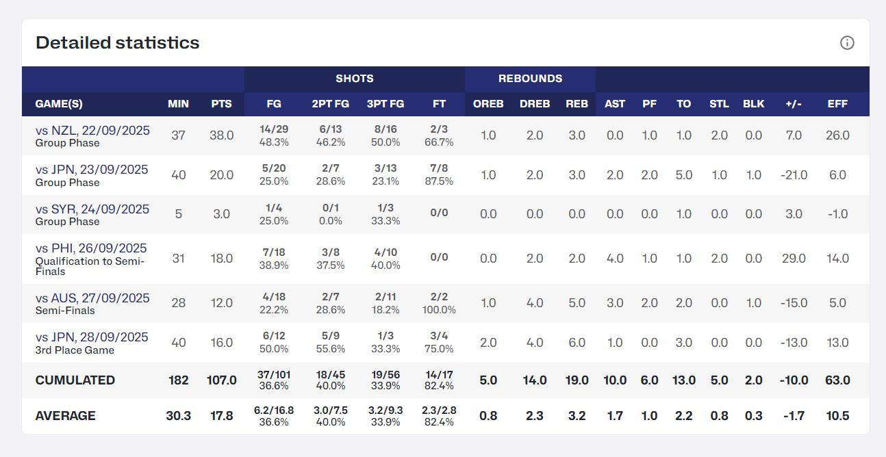 李沅珊場均30.3分鐘,拿到17.8分3.2籃板1.7助攻0.8搶斷0.3蓋帽,命中率38.8%,三分命中率33.9%,場均命中3.2個三分球,得分排在亞洲盃第二,場均三分命中數則是第一。