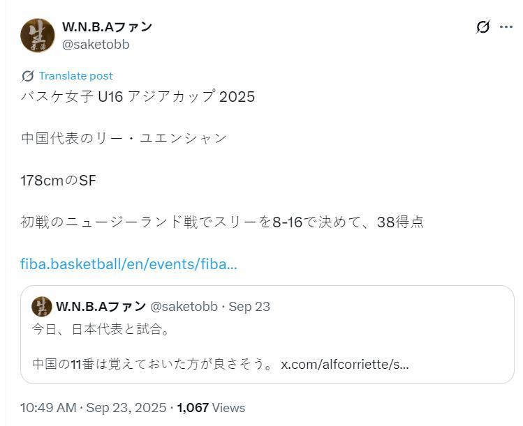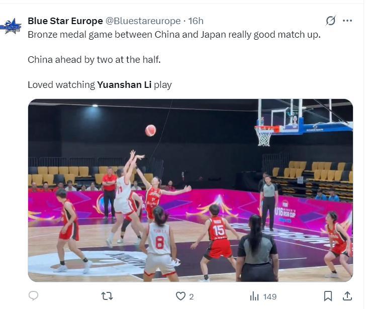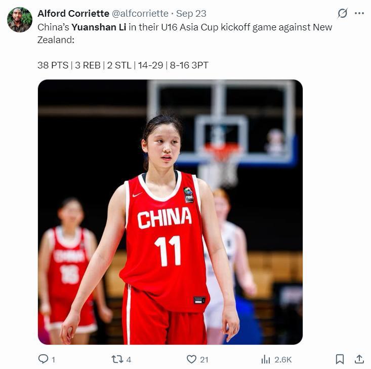 美國球探曬出李沅珊用科比式後仰的瞬間寫道:中日銅牌戰的對決非常精彩,很喜歡看李沅珊打球。