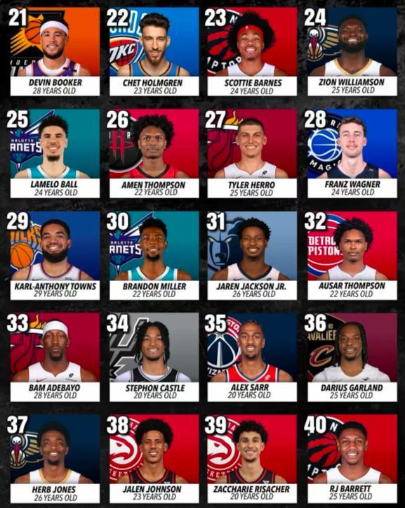 11.25歲哈利伯頓、12.24歲莫布利、13.24歲傑威、14.28歲布朗、15.32歲濃眉、16.27歲特雷楊、17.26歲莫蘭特、18.29歲米切爾、19.24歲馬克西、20.23歲申京;