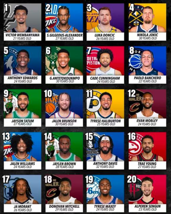 1.21歲文班亞馬、2.27歲亞歷山大、3.26歲東契奇、4.30歲約基奇、5.24歲愛德華茲、6.30歲揚尼斯、7.24歲坎寧安、8.22歲班凱羅、9.27歲塔圖姆、10.30歲布倫森;