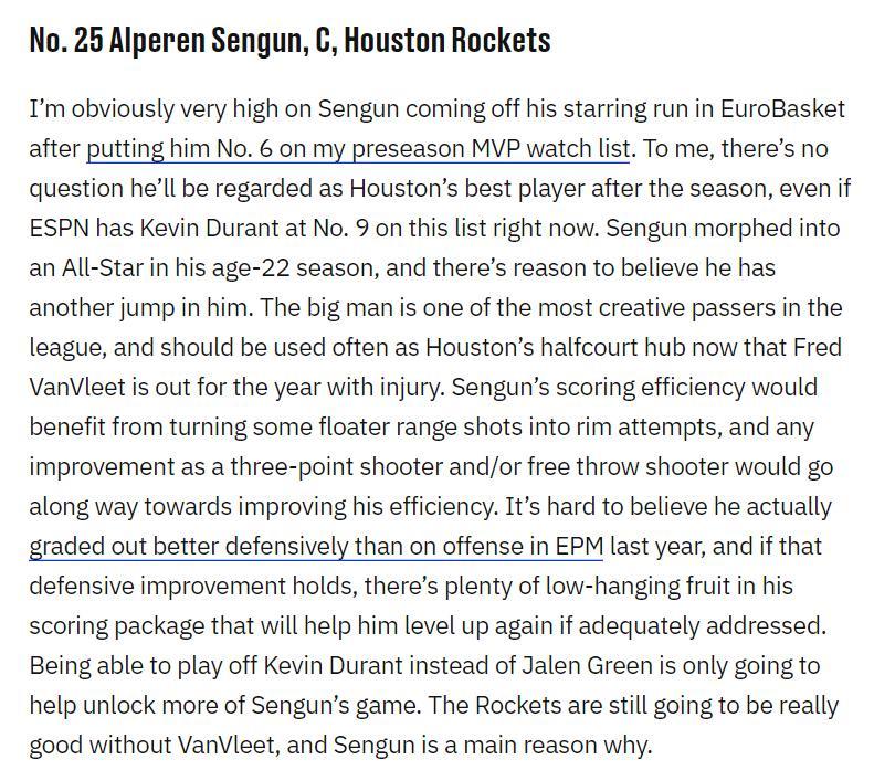 SB NATION寫道:顯然在申京打完歐洲盃後他對他的評價大幅提升,我甚至將他納入新賽季初MVP前六。在我看來他在下賽季結束後毫無疑問是火箭最佳球員,即便是ESPN將杜蘭特排在第九。