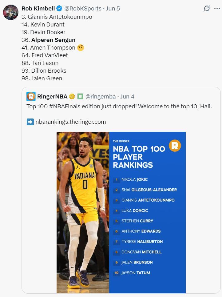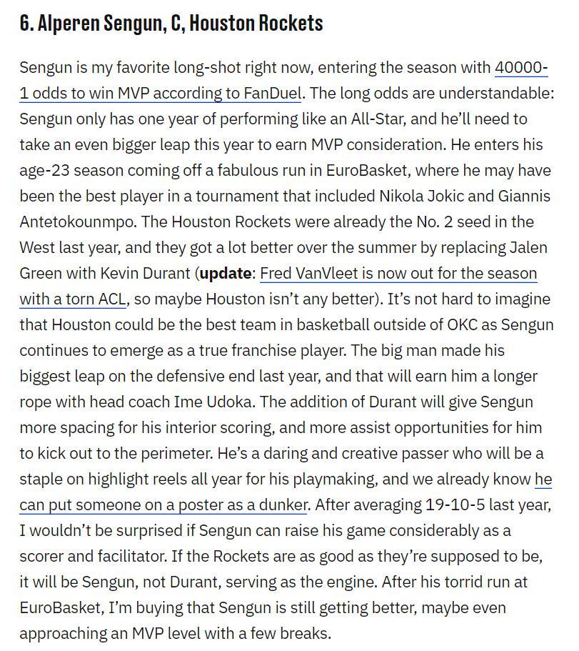 他將申京排在MVP第六的位置,根據FD的數據,申京的MVP賠率是40000:1。去年他場均19+10+5入選全明星,險些成爲最佳三陣選手,要成爲MVP前六的確有些困難,可去年他們就是西部第二,今夏把格林換成了杜蘭特硬實力大增,範弗利特的報銷我不認爲會對火箭戰績有多大影響,申京歐洲盃場均21.6+10.1+6.6+1+1.1的表現足以證明他是超級球星,火箭的絕對核心也會是申京而非杜蘭特,他的數據會迎來大幅提升,如果火箭繼續是僅次於雷霆的球隊,申京進入MVP前六是有可能的。