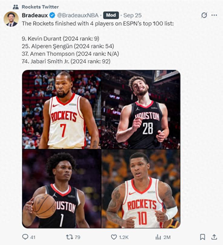 幾天前,ESPN評選的聯盟百大球星火箭隊有四人入榜:杜蘭特9、申京25、阿門37、小賈巴里74,看起來四人入選已經挺不錯了?