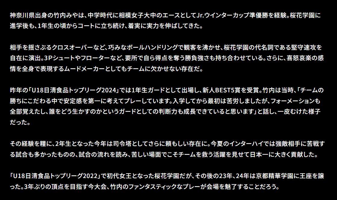 竹內美也選手的目標是成爲日本第一的初中生,她非常擅長持球1打1,她的偶像一直都是登陸NBA的河村勇輝,她表示河村的影響力之高對女子籃球界也有深入的影響,自己會朝着河村選手那樣努力。(河村勇輝1.72米)