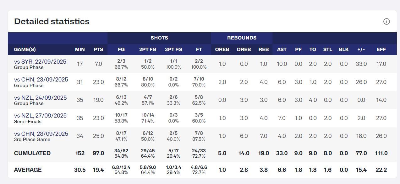 竹內美也這5場比賽,場均30.5分鐘,拿到19.4分6.6助攻3.8籃板1.6搶斷,命中率54.8%,三分命中率29.4%,得分、助攻都是賽會第一,對陣中國隊兩場都拿到23+5的數據,半決賽VS新西蘭也拿到23+7的數據。