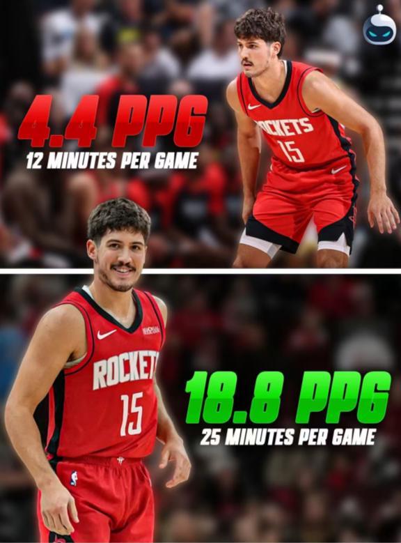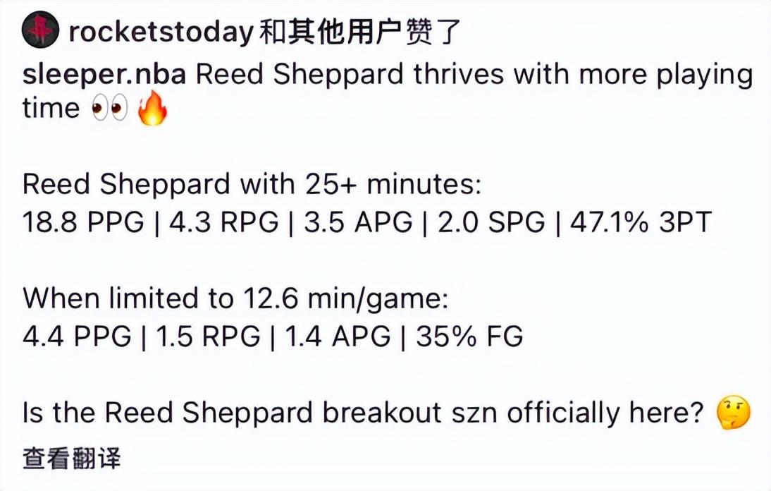 休斯頓媒體Sleeper.nba曬出兩組數據,謝潑德場均12.6分鐘,只能拿到4.4分1.5籃板1.4助攻,命中率35%,三分命中率33.8%。