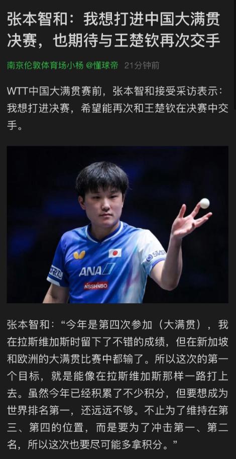 實際上在北京大滿貫之後,張本智和接受採訪,他表示希望自己可以打入北京大滿貫的決賽,再度與王楚欽選手對壘,而且自己的目標是世界第一,他想盡可能的多拿積分,世界排名第三、第四已經不能滿足他,結果呢?他止步64強了!