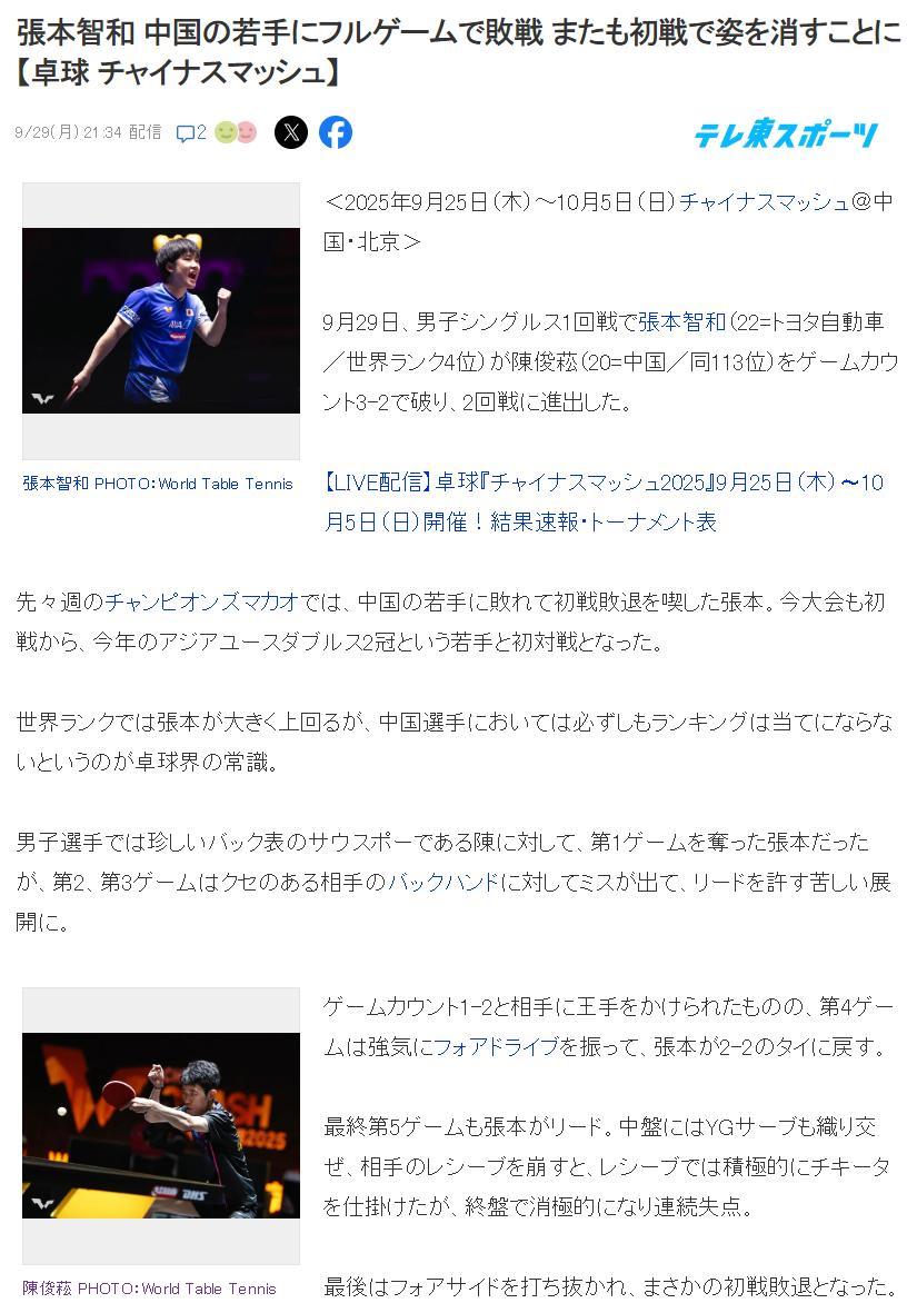 賽後日本媒體《東京體育網》第一時間發文:張本智和選手與中國年輕選手鏖戰五局敗北,張本智和作爲世界排名第四首輪遊止步64強。