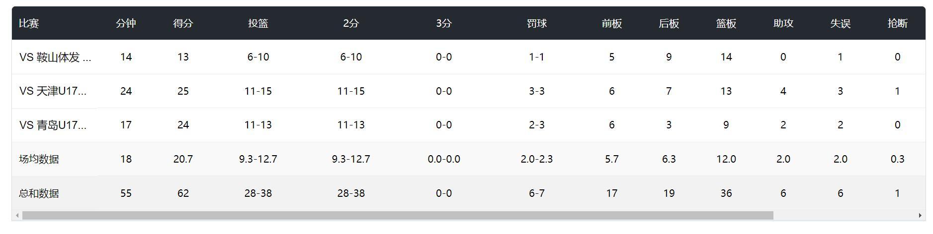 目前他已經在U17聯賽打了三場比賽,首秀14分鐘牛刀小試10中6,命中率60%,拿到13分14籃板;