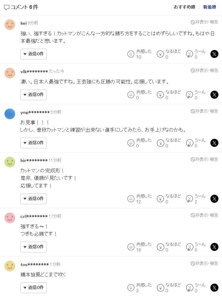 看看日本球迷的呼聲:1.強,太強了,橋本選手如同理髮師一樣直接剃了對方光頭,我覺得橋本帆乃香是日本最強;
