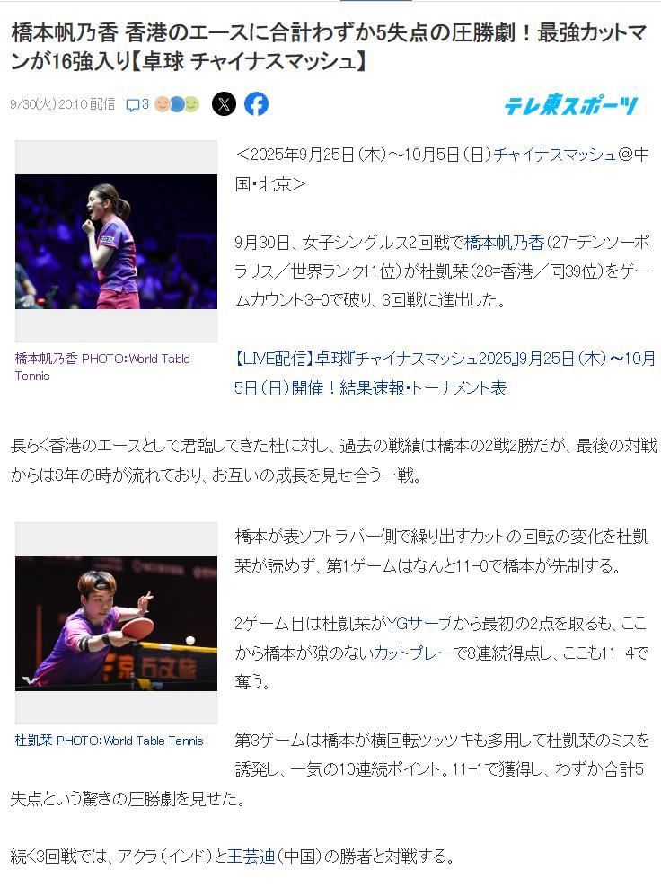 日本媒體《東京體育新聞》寫道:橋本帆乃香只讓中國香港王牌杜凱琹三局拿5分,這是壓倒性的勝利,她是我們的最強理髮師。