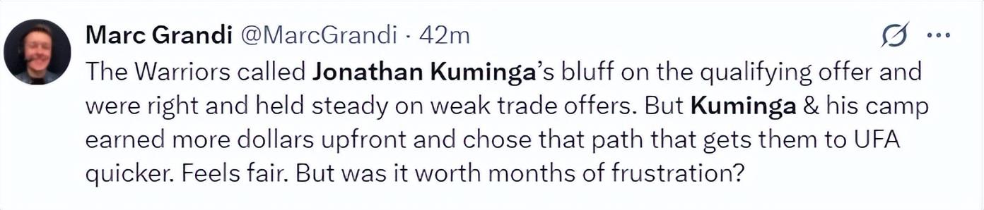勇士記者馬克-格瑞德寫道:勇士隊識破了喬納森-庫明加的虛張聲勢,拒絕了他想要球員選項的要求,並且在微不足道的交易報價中堅定立場。當然庫明加也收穫了相應的薪水,而且他可以更早的進入自由市場,這筆簽約還算公平。但這幾個月的拉扯真的值得嗎?