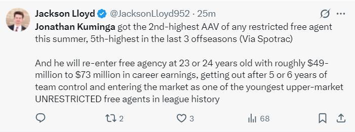 他將在23歲或24歲重新進入自由市場,屆時他的職業生涯收入約爲4900萬-7300萬(因爲是兩年合同,他可以選擇不跳出或跳出),在球隊擁有他的掌控權5-6年後,他將成爲聯盟歷史上最年輕+不受限制的頂級自由球員之一。