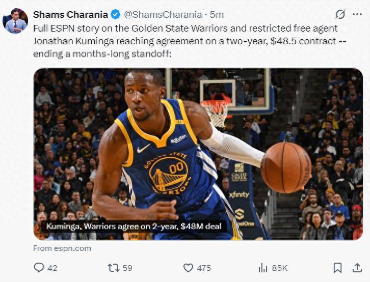 勇士媒體:經過一個夏天的拉鋸戰,勇士隊最終與庫明加達成協議,這份兩年4850萬的合同是雙贏的結果,勇士隊可以全身心投入到贏球的征程中,恭喜勇士管理層說服了庫明加保留球隊選項。