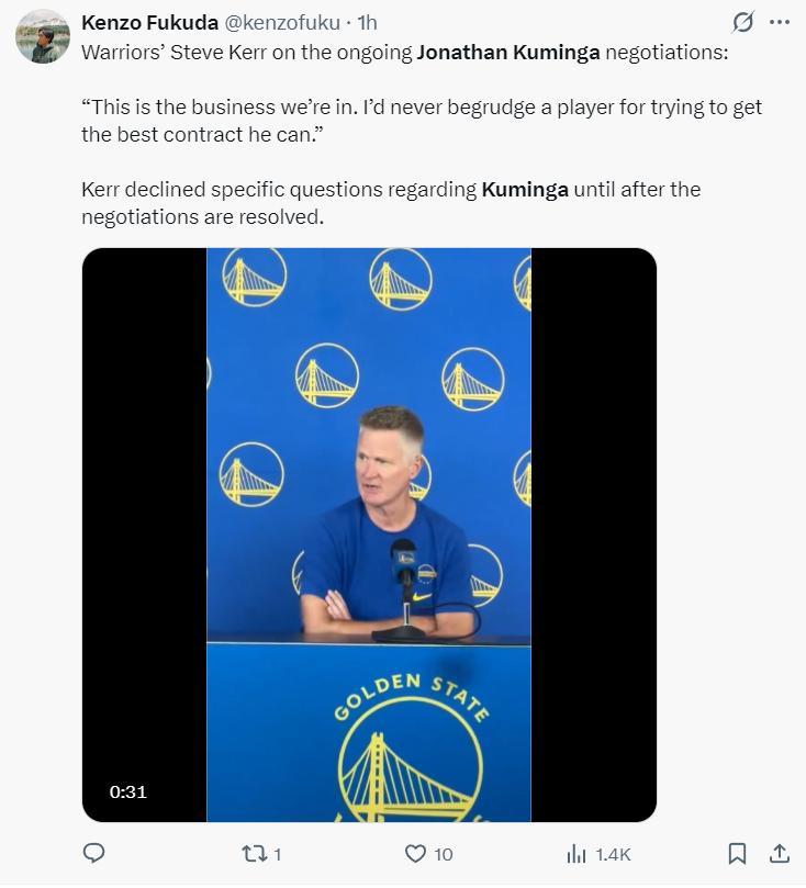 根據Shams的說法,庫明加選擇這份兩年4850萬的合同目的是明夏能夠重啓談判,他希望對自己未來有更高的掌控權。勇士隊在談判中對球隊選項的框架從未動搖,雙方簽訂合同後,勇士隊可以在明年一月探索庫明加的交易可能性。