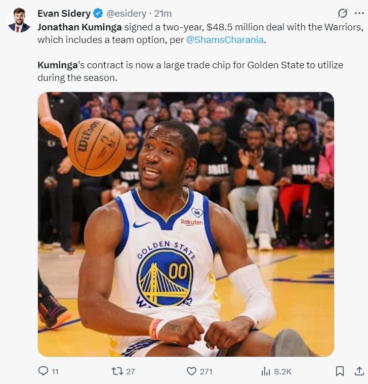 對此NBA記者埃文-斯迪瑞寫道:庫明加與勇士簽下兩年4850萬含有球隊選項的合同,那麼他的合同在本賽季會成爲勇士隊可利用的一大交易籌碼。