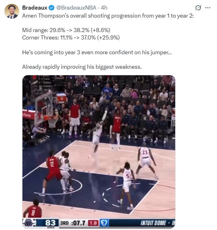 阿門二年級時已經開始讓軟肋消散,新秀賽季中投命中29.8%,上賽季已經提升到38.2%;新秀賽季底角三分命中率11.1%,而上賽季已經提升到25.9%,阿門的投射進步是對火箭最大的助力,因爲空間就更大了。